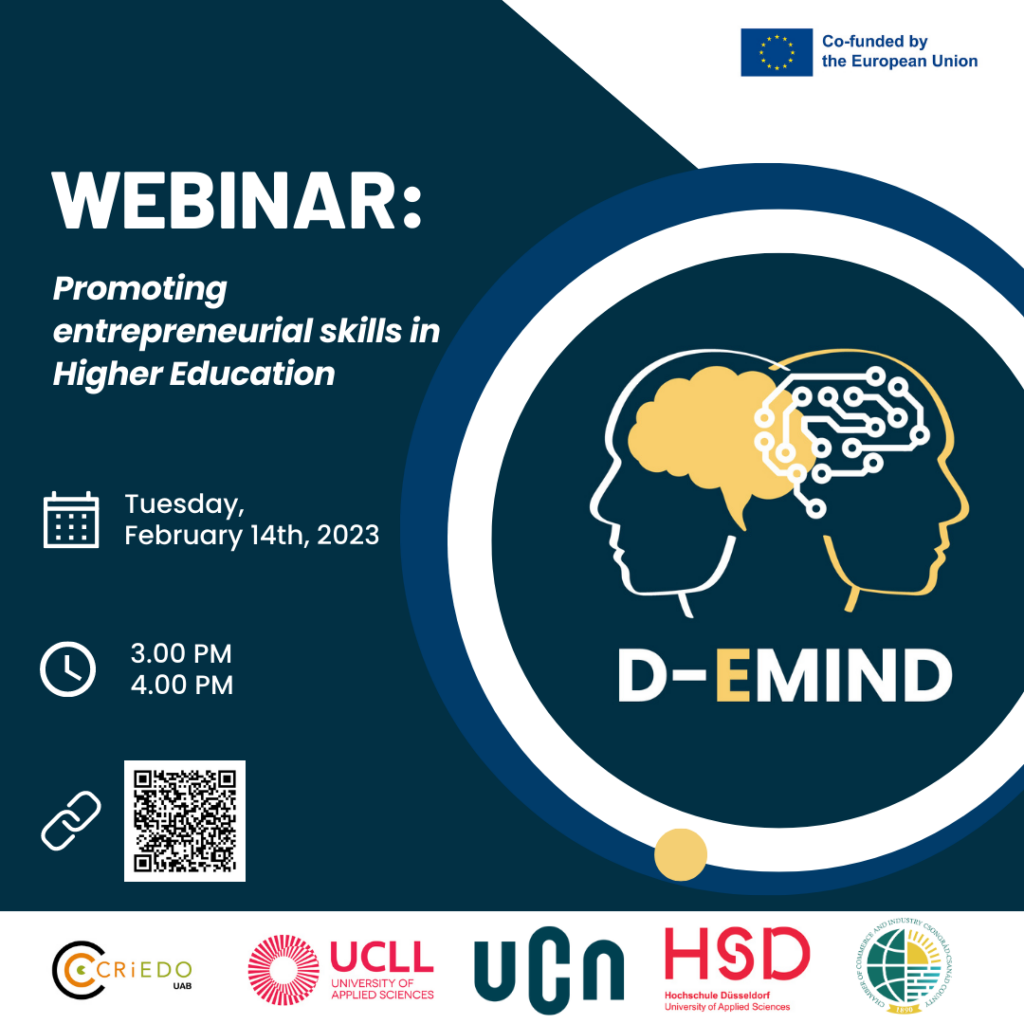 A D-EMIND projekt partnerei örömmel jelentik be ingyenes webinárium-sorozatukat, melynek célja a vállalkozói készségek fejlesztése a felsőoktatásban. Az első eseményen különböző projektek kerülnek bemutatásra neves szakértők által, fókuszálva a vállalkozói készségek fejlesztésére. A program tartalmazza a D-EMIND bemutatását a CRIEDO-UAB (Spanyolország) részéről, a Next Step és ForemLink projekteket az UCN (Dánia) képviseletében, az E.I.N.S projektet az UCLL (Belgium) által, valamint a C3 projektet a HSD (Németország) prezentálásában. Az érdeklődők, legyenek kutatók, oktatók, trénerek, hallgatók vagy vállalati képviselők, a következő linken regisztrálhatnak: https://docs.google.com/forms/d/e/1FAIpQLSc1DciBvnxsMtPpRMaoz8dFZvtxNM1nUVtTNRoZITIFotKsvA/viewform