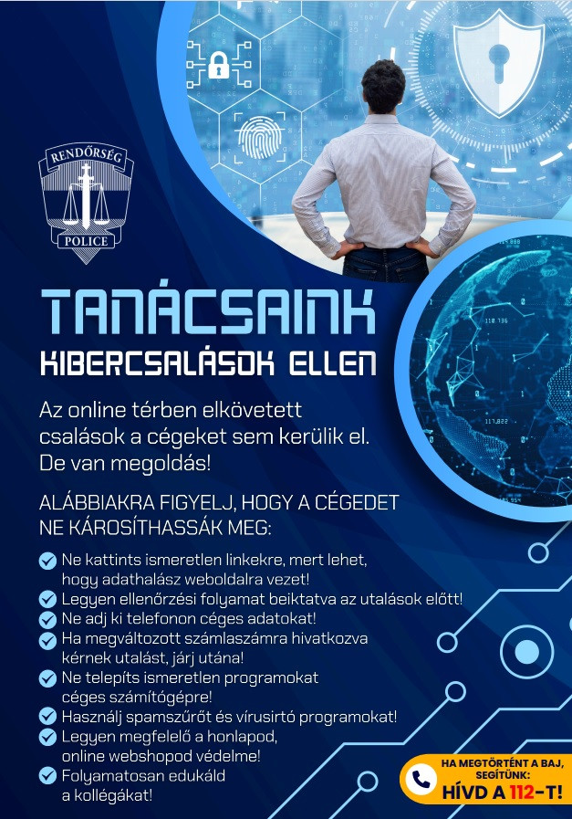 A vállalkozók számára is igen hasznos tanácsokat osztott meg az Országos Rendőr-főkapitányság Bűnmegelőzési Osztálya. A tudnivalókat kamaránkhoz is eljuttatta a rendőrség, az alábbi plakáton olvashatják azokat: