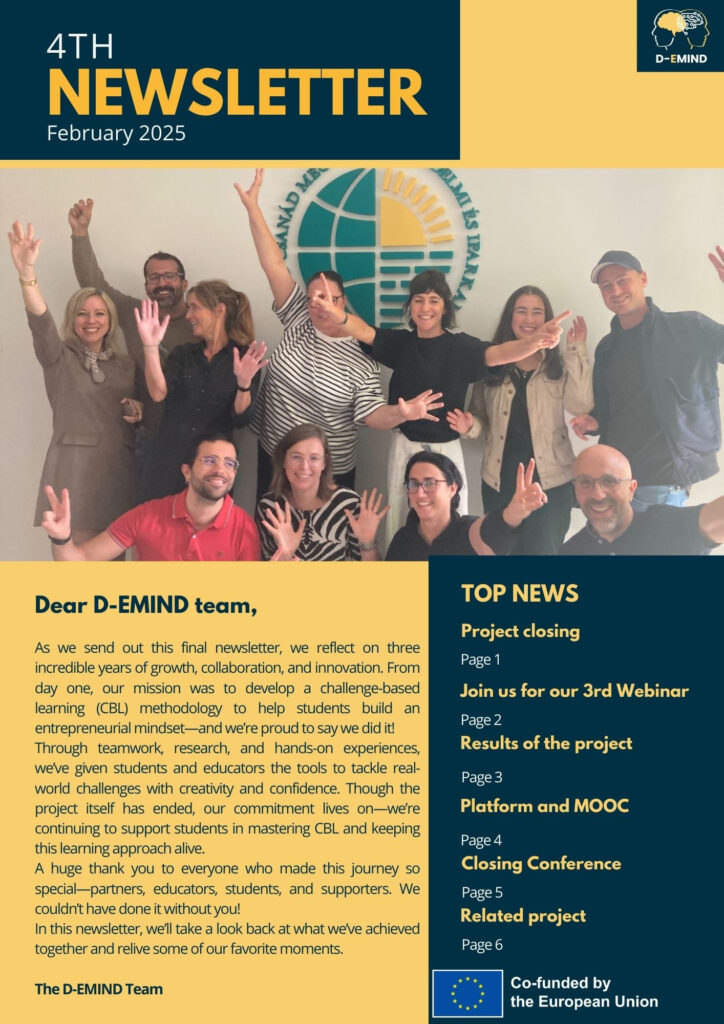 Szívből köszönetet mondunk minden partnernek, oktatónak, diáknak és támogatónak, akik hozzájárultak a projekt sikeréhez. Az utazás itt még nem ér véget – az D-EMIND forrásai továbbra is nyitva állnak és elérhetők azok számára, akik a valós vállalkozói készségek fejlesztése iránt szenvedélyesen érdeklődnek.