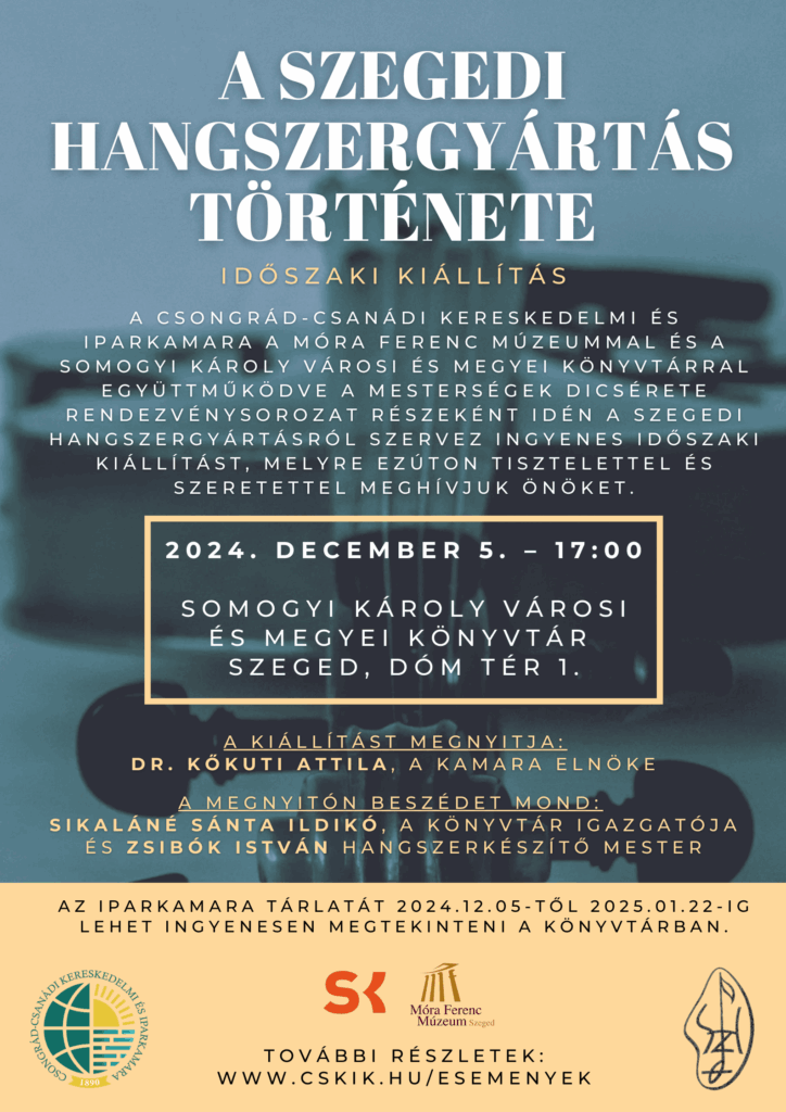 Kétgenerációnyi hangszerkészítő-mestert és többezernyi ékszerszámba illő hangszert termelt ki az 50 évet élt Szegedi Hangszergyár. A muzsikaszó 2003-ban bezárt fellegvárának emléke most újra feléled az iparkamara által, a szegedi hangszerkészítők kezdeményezésére. A Csongrád-Csanádi Kereskedelmi és Iparkamara a Mesterségek dicsérete kapcsán idén „A szegedi hangszergyártás története” tematikával szervez időszaki kiállítást a Móra Ferenc Múzeummal és a Somogyi Károly Városi és Megyei Könyvtárral együttműködve.