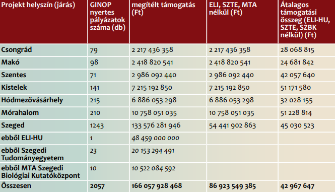 A több mint 2050 projektet közel 1300 különböző szervezet valósította meg, melynek csak egy része volt megyei székhelyű. A megítélt támogatás összege több mint 166 milliárd Ft volt, de ennek az összegnek közel a fele az ELI lézer kutatóközpont, a Szegedi Tudományegyetem és a Szegedi Biológiai Kutatóközpont projektjeit, fejlesztéseit finanszírozta. A járások közül kiemelkedik a mórahalmi járás, ahol több mint 10,7 milliárd Ft a megítélt támogatás. Az átlagos támogatási összeg 43 millió Ft volt, de pályázati kiírásonként nagy különbséggel.