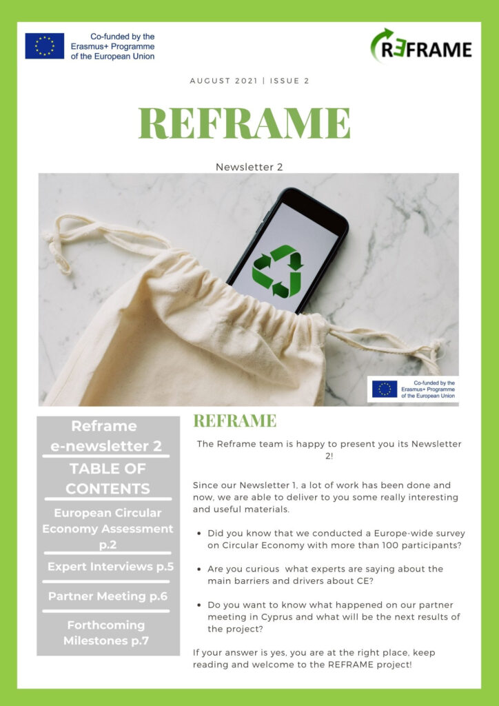 Elkészült a REFRAME – „Körkörös gazdasági keretrendszer fenntartható KKV-k számára” című, 2020-1-EL01-KA202-078870 azonosítójú, az Erasmus+ program társfinanszírozásával megvalósuló projekt 2. hírlevele, melyben számos érdekes tartalommal ismerkedhetnek meg a körkörös gazdaság iránt érdeklődők. Hírlevelünkben összefoglaltuk annak a felmérésnek az eredményeit, amelyet több, mint 100 vállalkozás képviselője töltött ki Európa szerte, illetve a körkörös gazdaság szakértőivel folytatott interjúk főbb pontjait is megismerhetik.